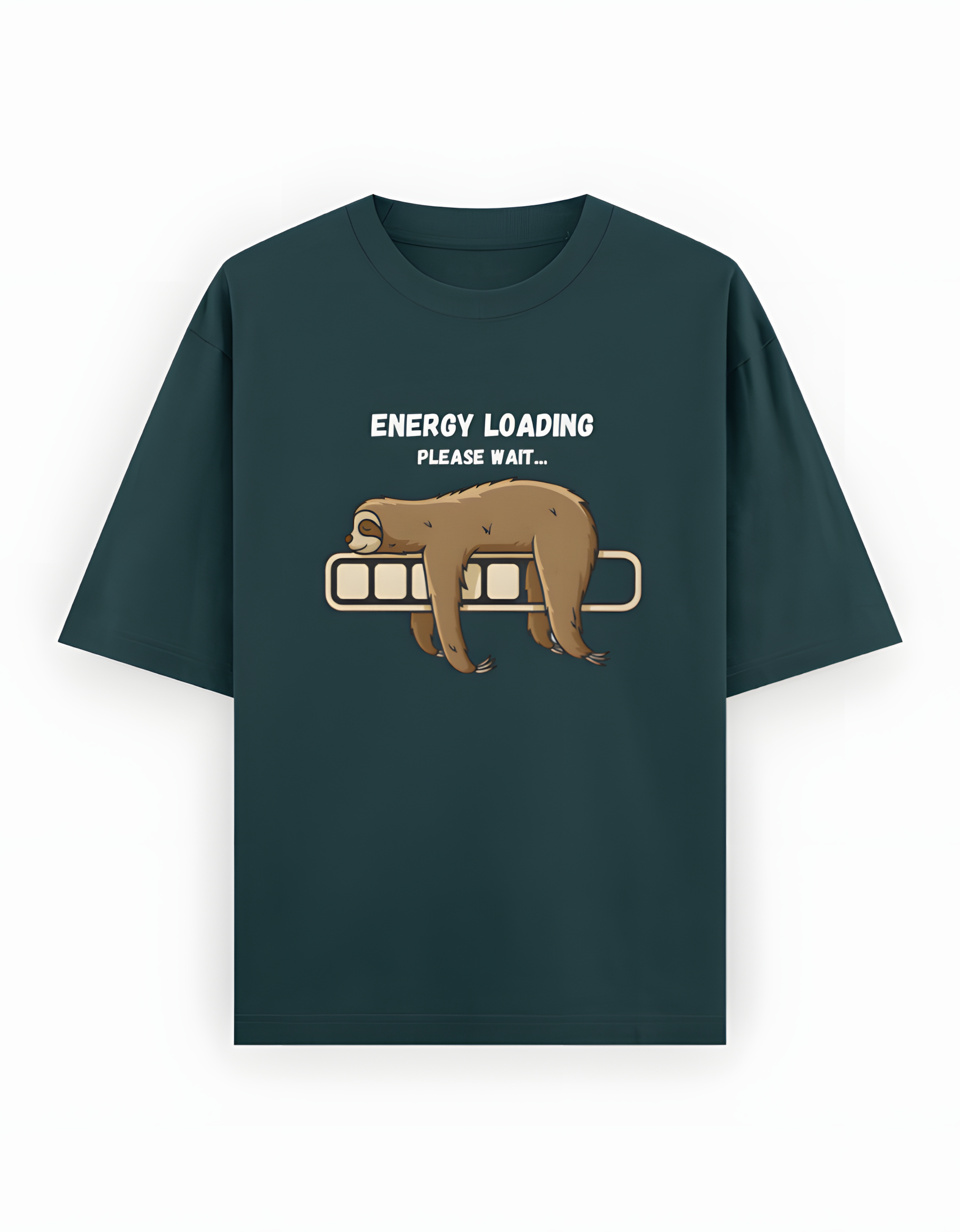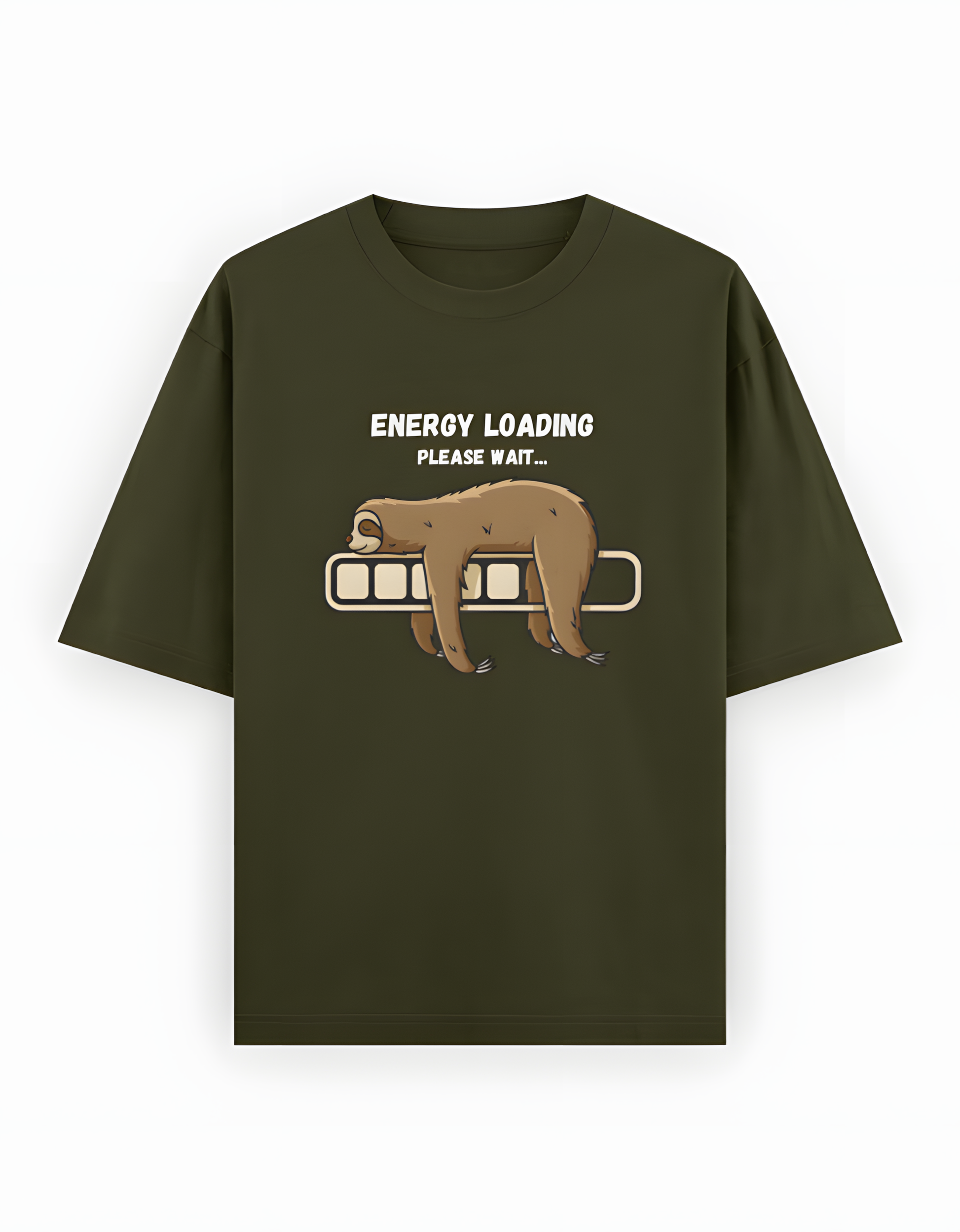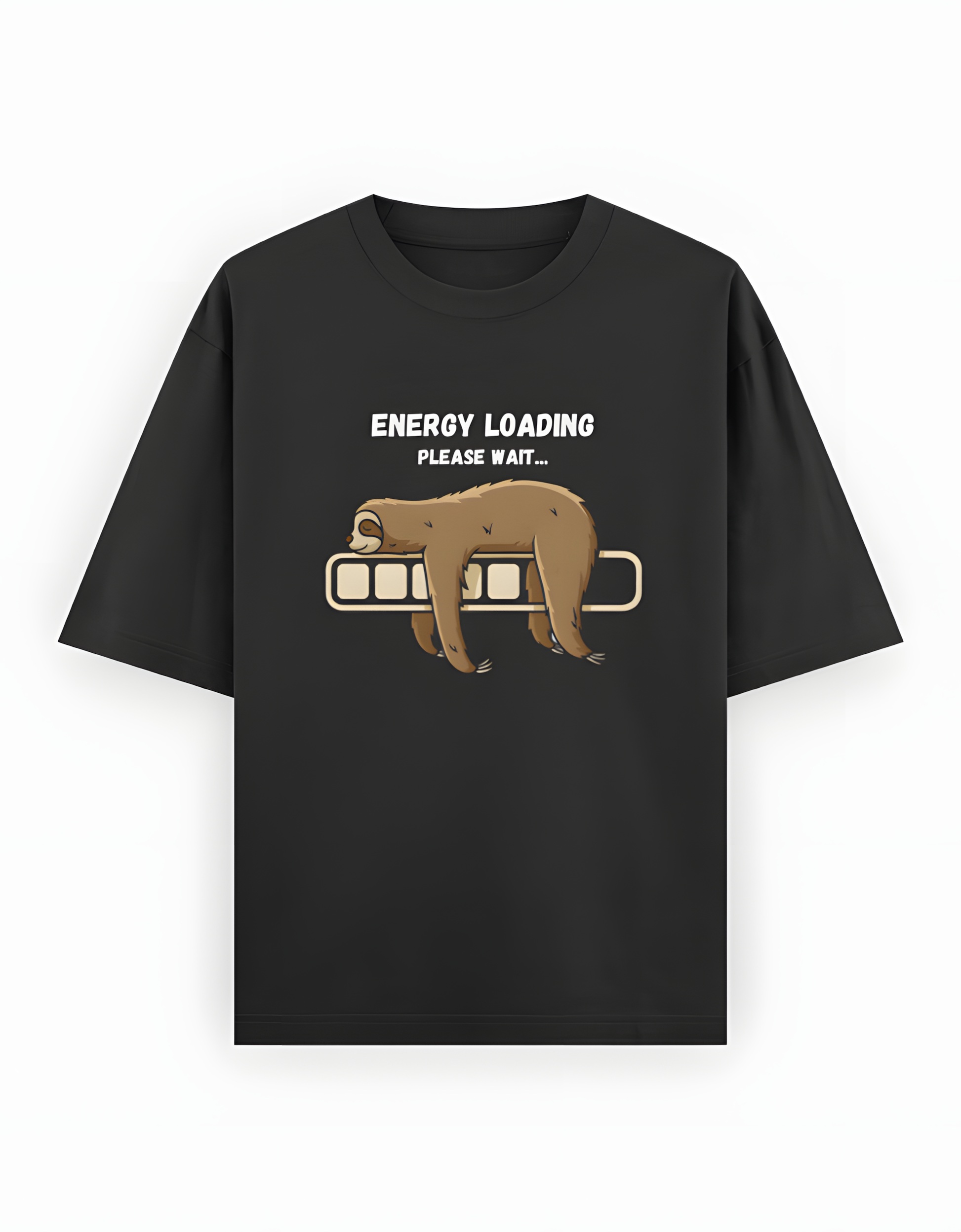 This solid color oversized tee features a cartoon sloth stretched across a half-filled loading bar, paired with the phrase “ENERGY LOADING PLEASE WAIT...” A humorous nod to low-energy days, designed for laid-back moods and unapologetic chill.