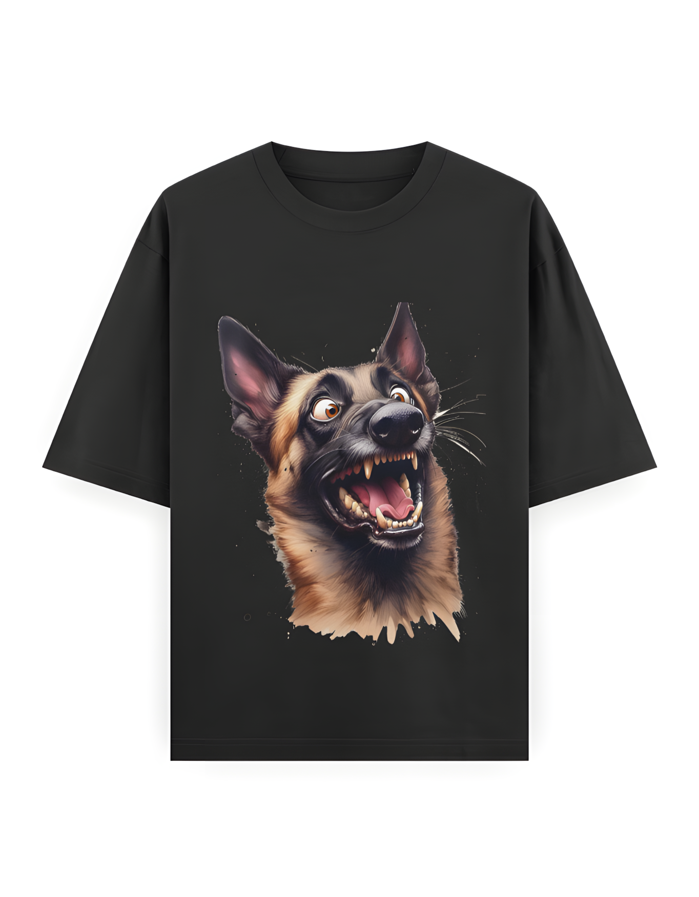 This solid cream oversized tee features a hilarious, high-energy illustration of a German Shepherd. With wide eyes and a goofy toothy grin, it captures that exact split-second expression when the word "treat" is spoken. A fun, expressive piece for dog lovers who embrace the chaotic energy of their furry friends.