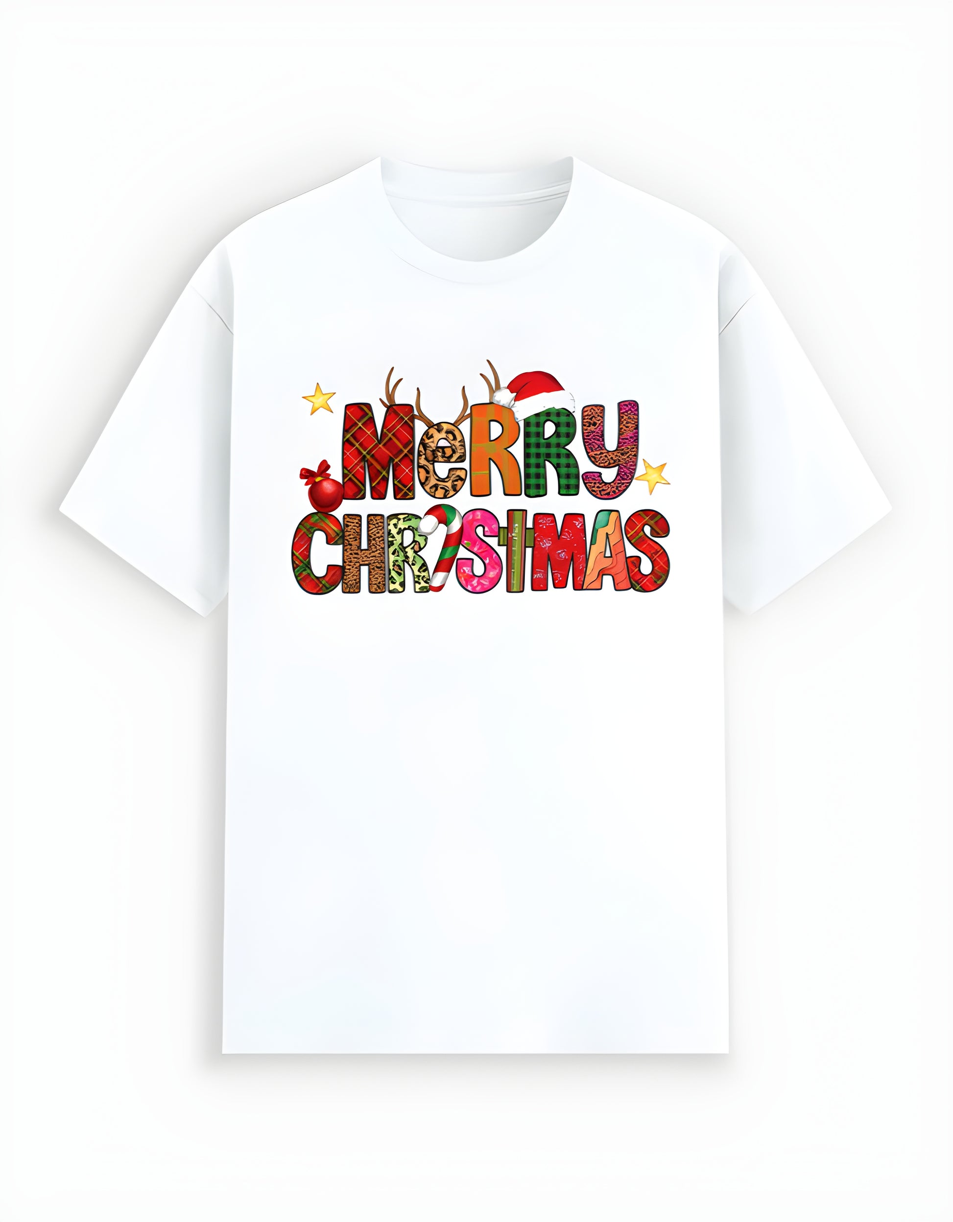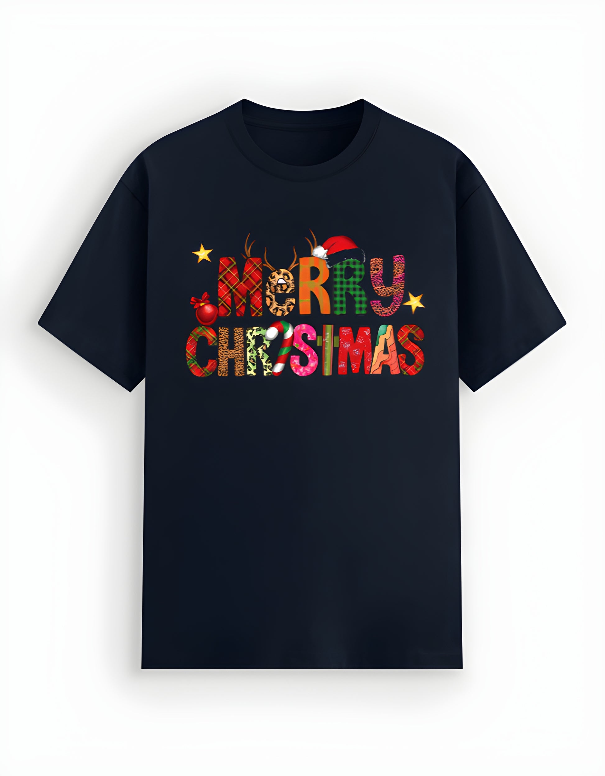 This solid black tee features a vibrant "MERRY CHRISTMAS" typography design where every letter tells a story. From classic plaid and leopard print to candy cane stripes, this design is topped with reindeer antlers and a Santa hat for the ultimate holiday spirit.